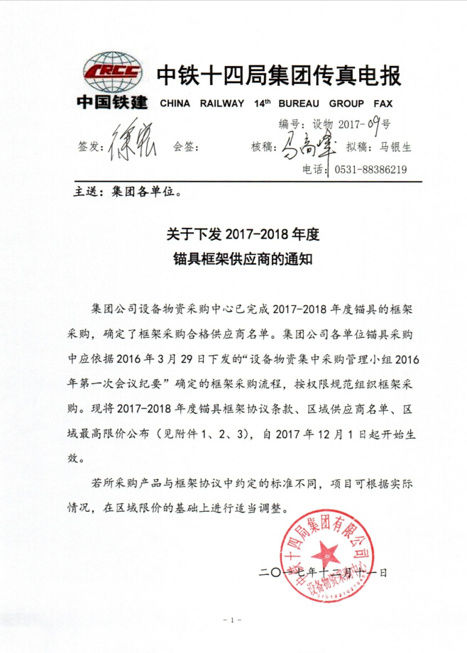 Notice on issuing anchor frame supplier for 2017-2018