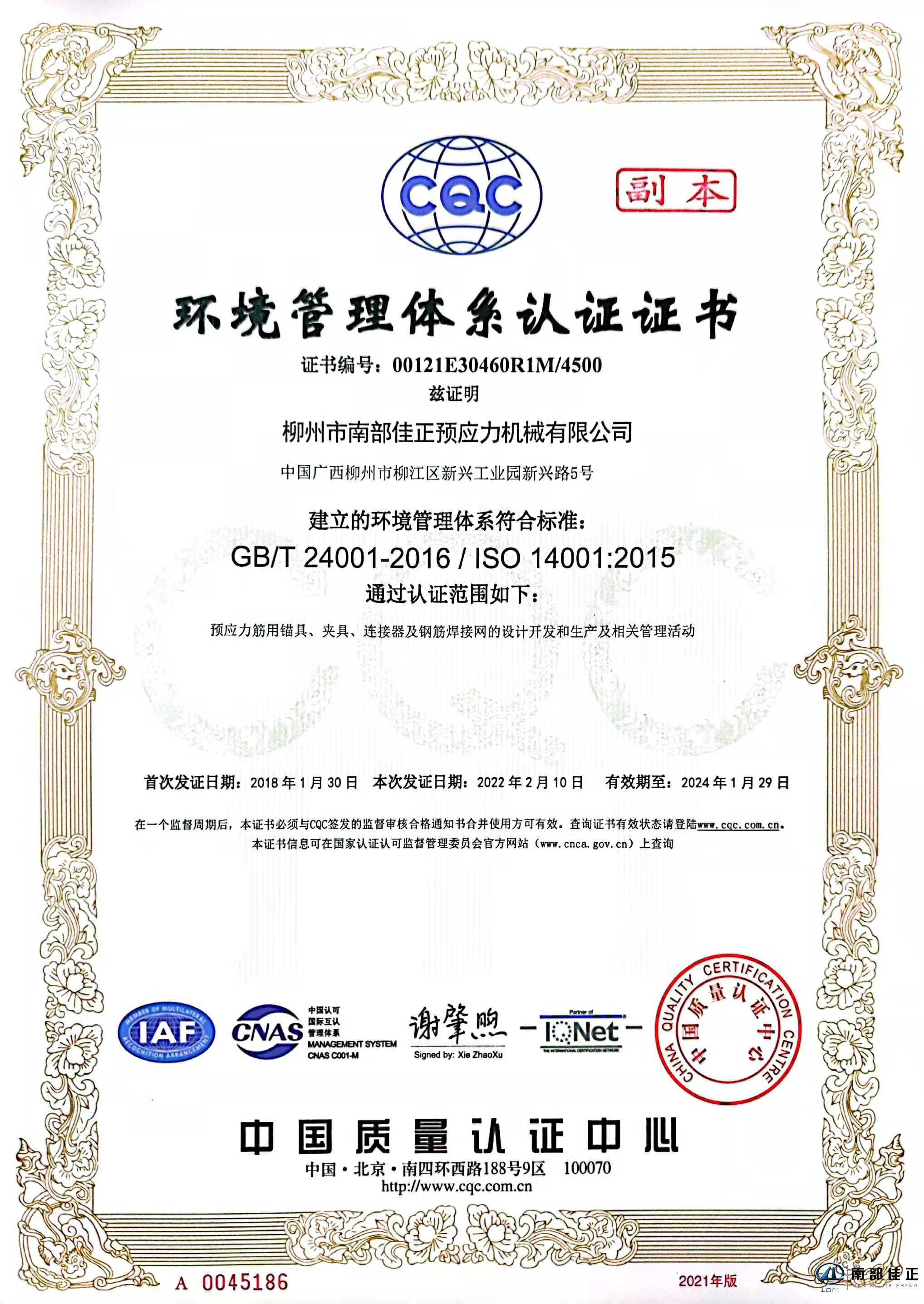 環(huán)境管理體系認(rèn)證證書